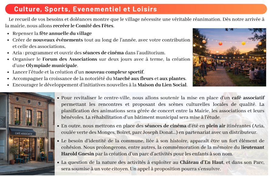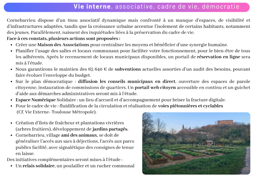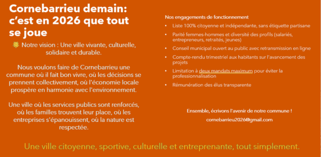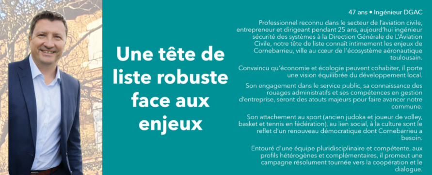 Ces engagements préalables deviennent une force pour défendre les intérêts et les projets de Cornebarrieu avec détermination auprès de Toulouse Métropole. Une équipe aux compétences et expertises techniques solides et indiscutables, y compris électorales, au service d’un programme rigoureux et finançable.