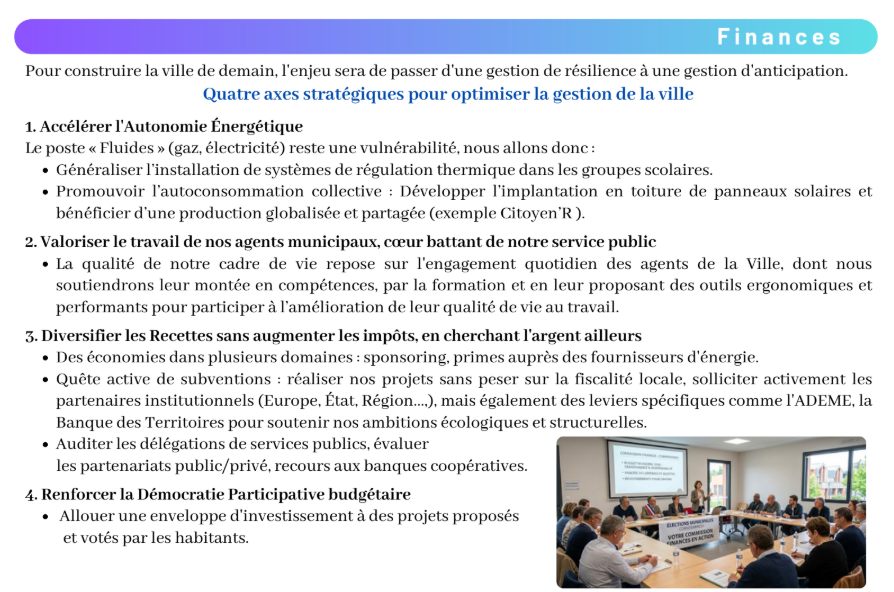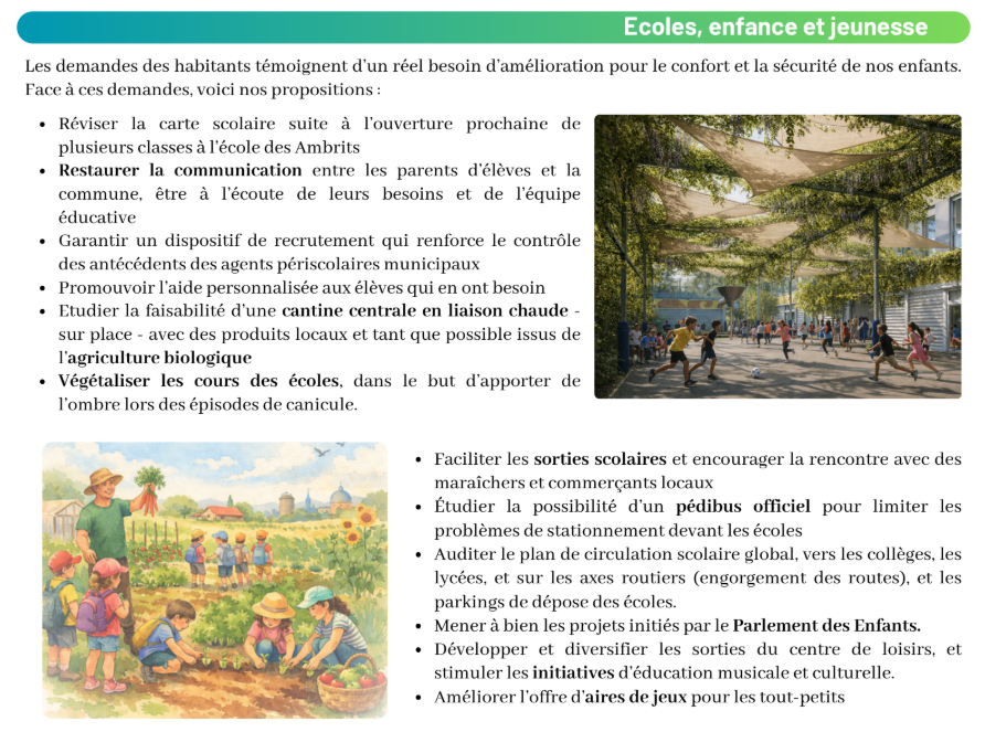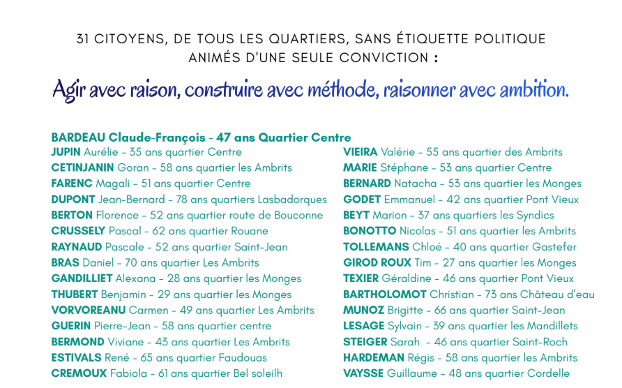 Les 31 membres de notre équipe vivent dans vos quartiers : ils y élèvent leurs enfants, partagent vos trajets, vos écoles, votre quotidien. Pendant des mois, en 8 commissions, nous avons épluché les comptes rendus des Conseils municipaux et communautaires, consulté et écouté les habitants.